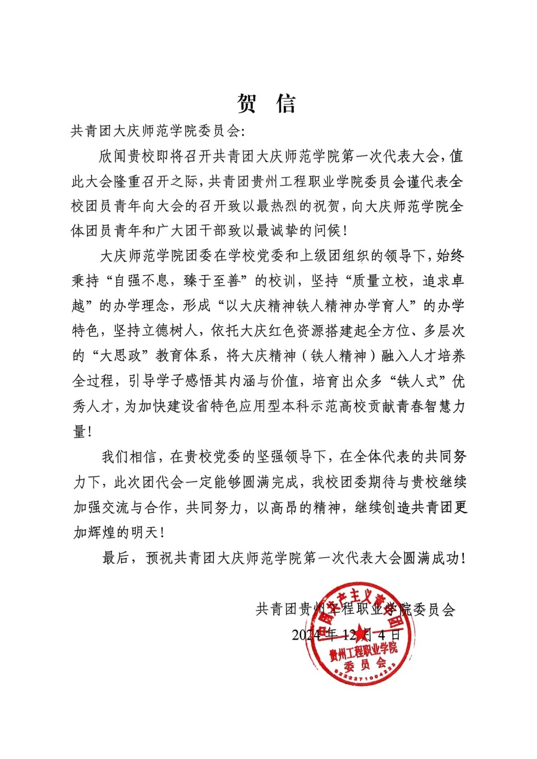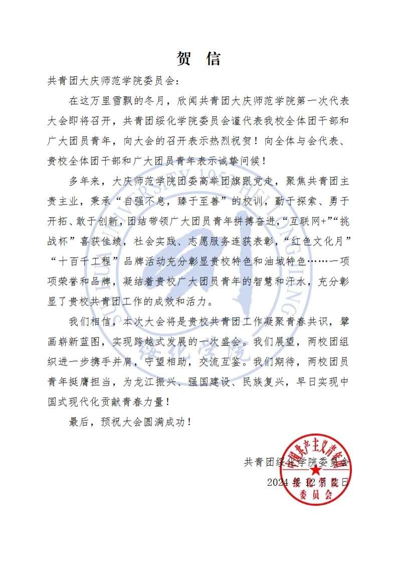 共青团大庆师范学院第一次代表大会将于12月7日召开。大庆市让胡路区委区政府、共青团大庆市让胡路区委员会以及清华大学、北京大学、哈尔滨工程大学等友好单位和兄弟高校团组织纷纷向我校致以热烈的祝贺,表达了对团代会召开的真诚祝福与殷切期望。感谢各友好单位和兄弟高校团组织的关心与支持,让我们携手并肩,引领广大青年团员在中国式现代化建设中勇担使命、奋力前行。