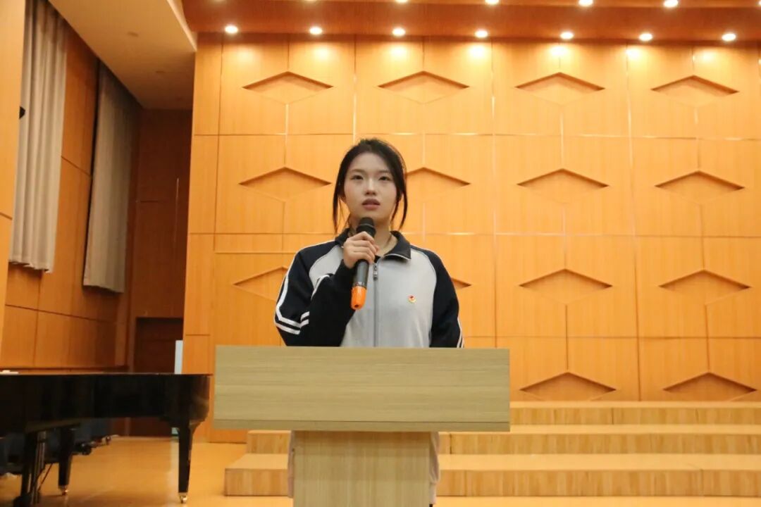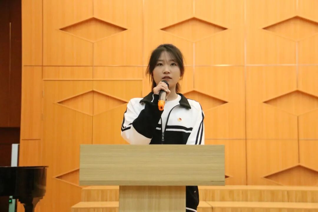 2025级音乐教育一班朱彤同学作为新团员代表发言。她表示,将以入团为新起点,严守团的纪律,深耕专业学习,积极投身校园文化建设与社会实践,以青春之我践行团员使命。优秀团员代表2024级音乐表演(器乐)二班高艺萌同学分享了自己的成长经历与感悟,鼓励新团员们以理想为灯、以实干为径,在青春赛道上勇毅前行,让团旗在奋斗征程中熠熠生辉。