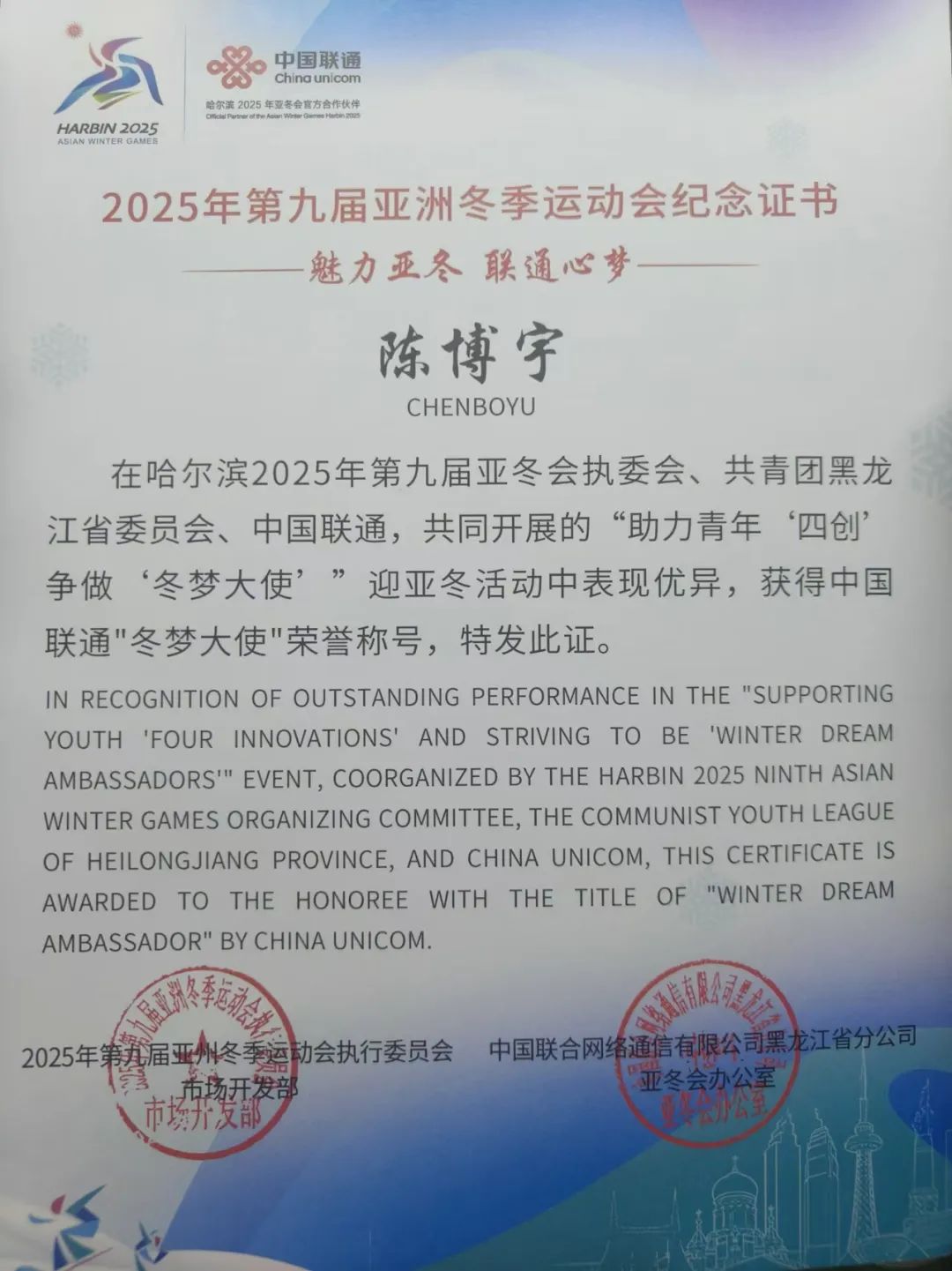 近日,由2025年第九届亚洲冬季运动会执行委员会、共青团黑龙江省委员会、中国联通黑龙江省分公司联合主办的“助力青年‘四创’争做‘冬梦大使’”迎亚冬系列活动在黑龙江大学落下帷幕。我校在本次活动中获省级奖项4项,4名学生被授予“冬梦大使”称号,其中,徽章设计类30件获奖作品中我校获优胜奖3项,短视频创作类20件获奖作品中我校获三等奖1项。