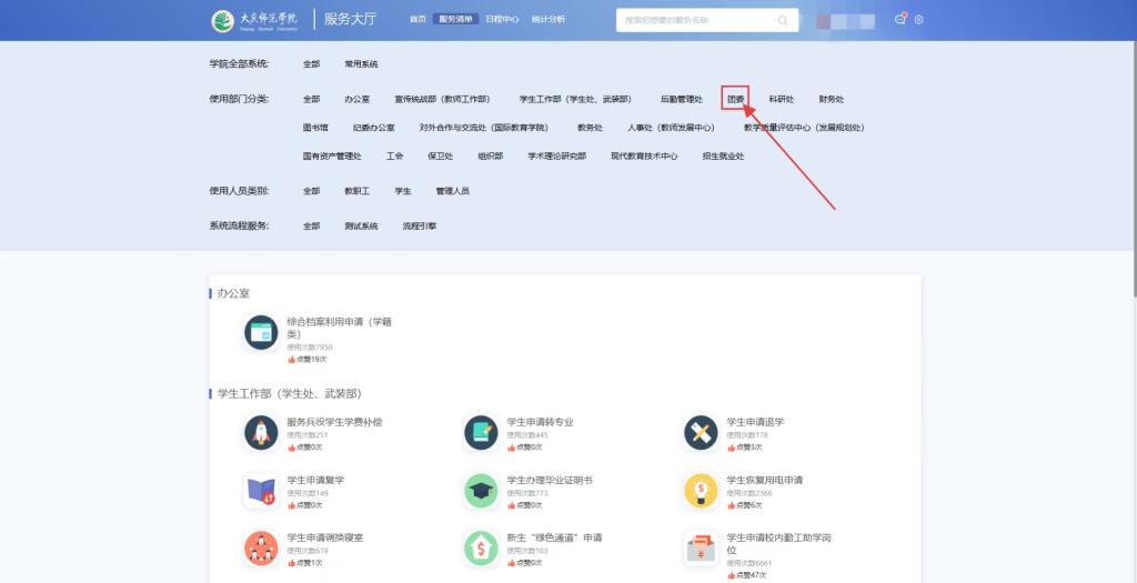 第三步:在上方“使用部门分类”里面点击“团委”选项。